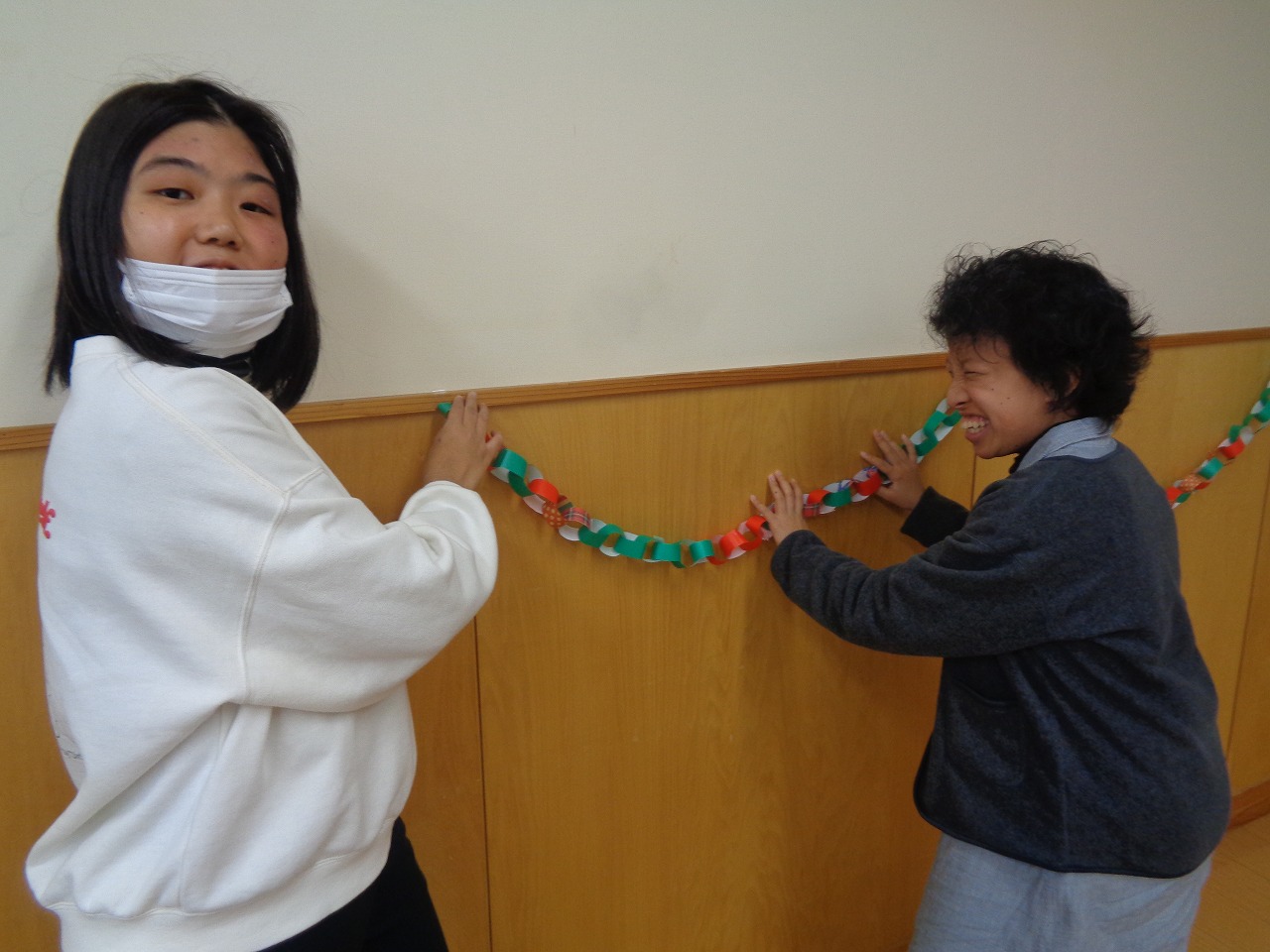 この日の為にみんなで手づくりのリースをたくさん作りました。飾り付けのお手伝いをしています。